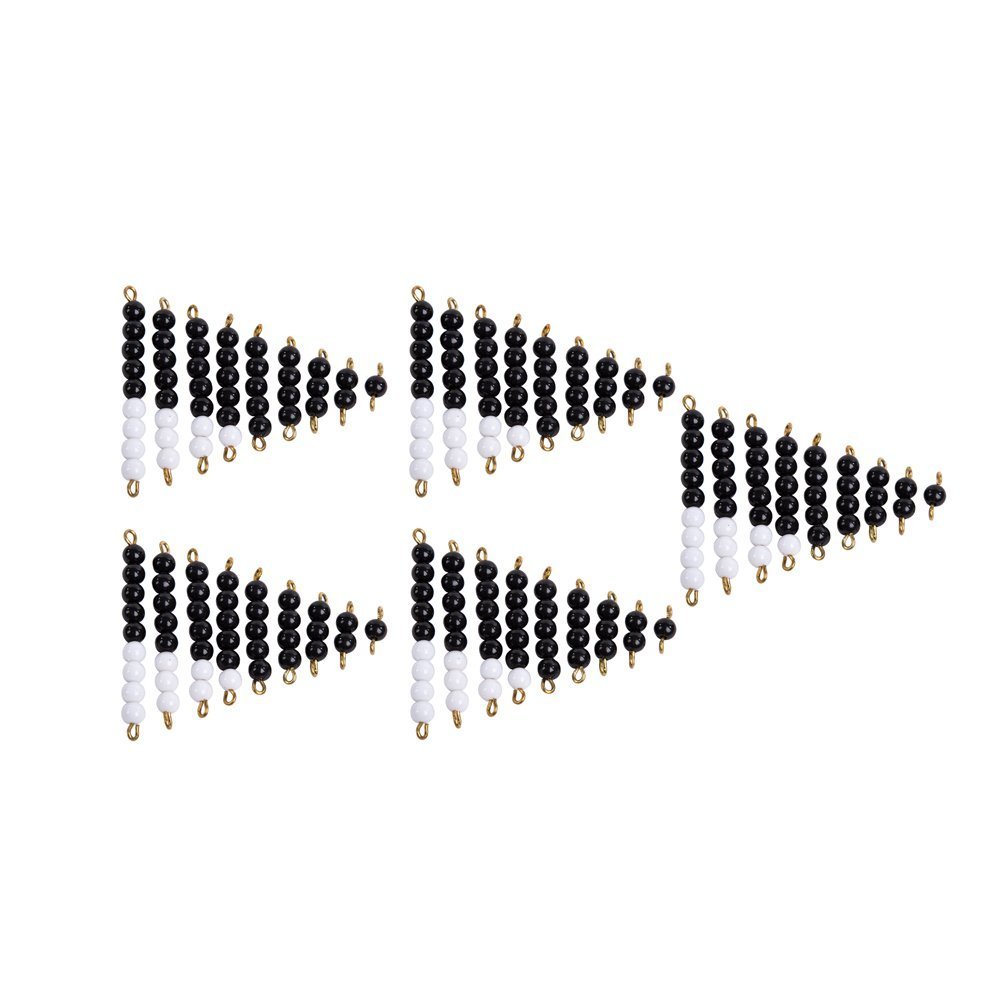 Incluye cinco pares de escaleras donde cada par contiene hileras de cuentas en escalas de 1 a 9 en tonos neutros. Se usa para ejercicios de emparejar, comparar y reforzar la secuencia numérica sin la distracción del color, favoreciendo la observación precisa.