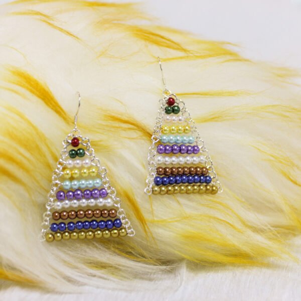 Aros triangulares elaborados con cuentas Montessori multicolores que evocan la armonía y el equilibrio presentes en el método. Su forma y tonalidades reflejan la estética sensorial Montessori, fusionando elegancia artesanal con significado educativo.
