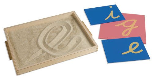 El niño traza con los dedos la forma de la letra sobre la superficie de lija, y luego repite el trazo sobre la bandeja de arena, arroz o sémola, fortaleciendo la memoria muscular y la coordinación ojo-mano.