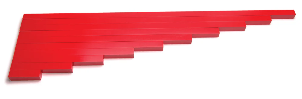 Las Barras Rojas están compuestas por 5 barras de madera del mismo color, pero de longitudes crecientes y proporcionales. El niño las ordena desde la más corta hasta la más larga, construyendo una percepción clara de gradación lineal.