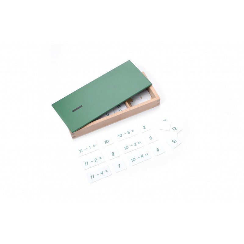 La caja incluye tarjetas de ecuaciones y tarjetas de resultados, organizadas por dificultad progresiva. El niño empareja las ecuaciones con sus soluciones, trabajando la resta de forma manipulativa y autónoma.