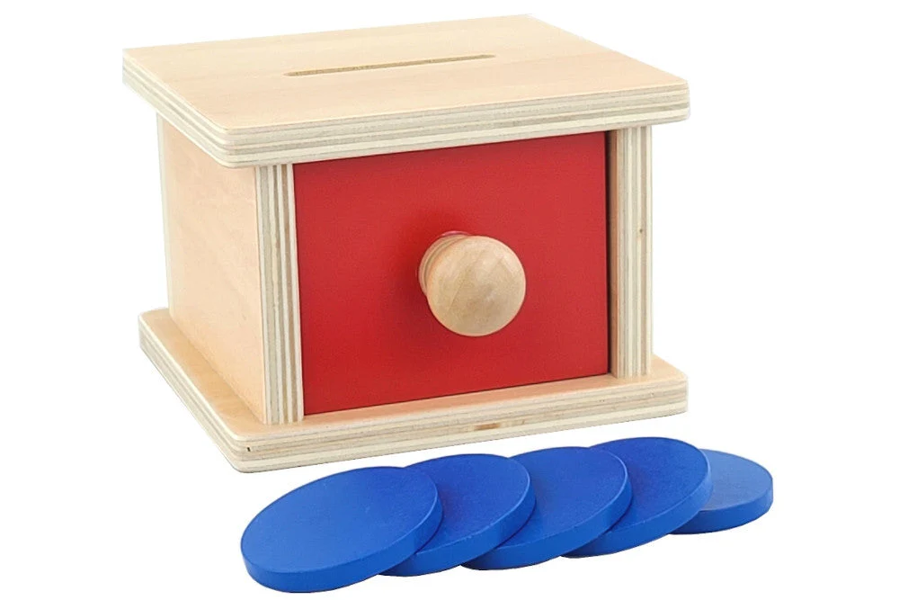 Este material consiste en una caja de madera de alta calidad con un orificio circular calibrado en la tapa superior diseñado para que el niño introduzca un cilindro de madera de tamaño reducido que coincide perfectamente con ese hueco. Luego de insertar el cilindro y “hacerlo desaparecer”, el niño lo recupera abriendo una pequeña puerta o cajón frontal.