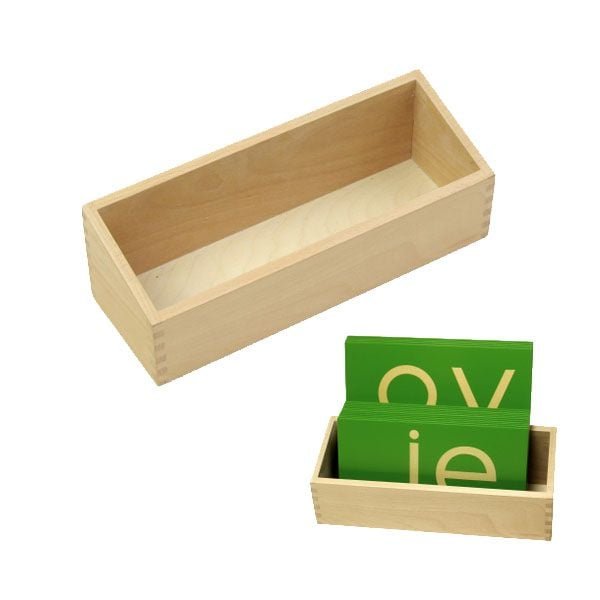 Esta caja de madera está adaptada al tamaño de las letras minúsculas de lija y facilita su orden por grupos fonéticos o alfabéticos.