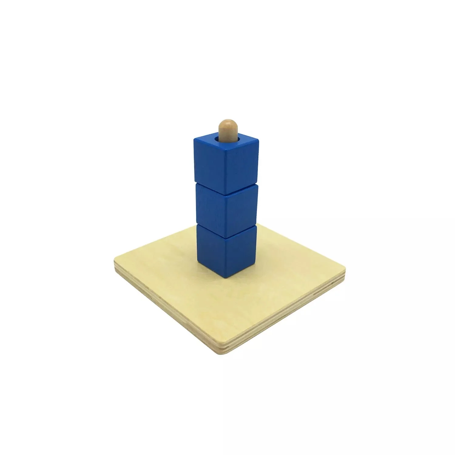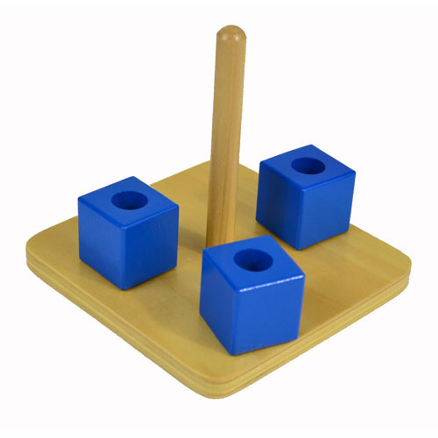 Este material consta de una base de madera con una varilla vertical en la que se colocan tres cubos que el niño debe deslizar o apilar.