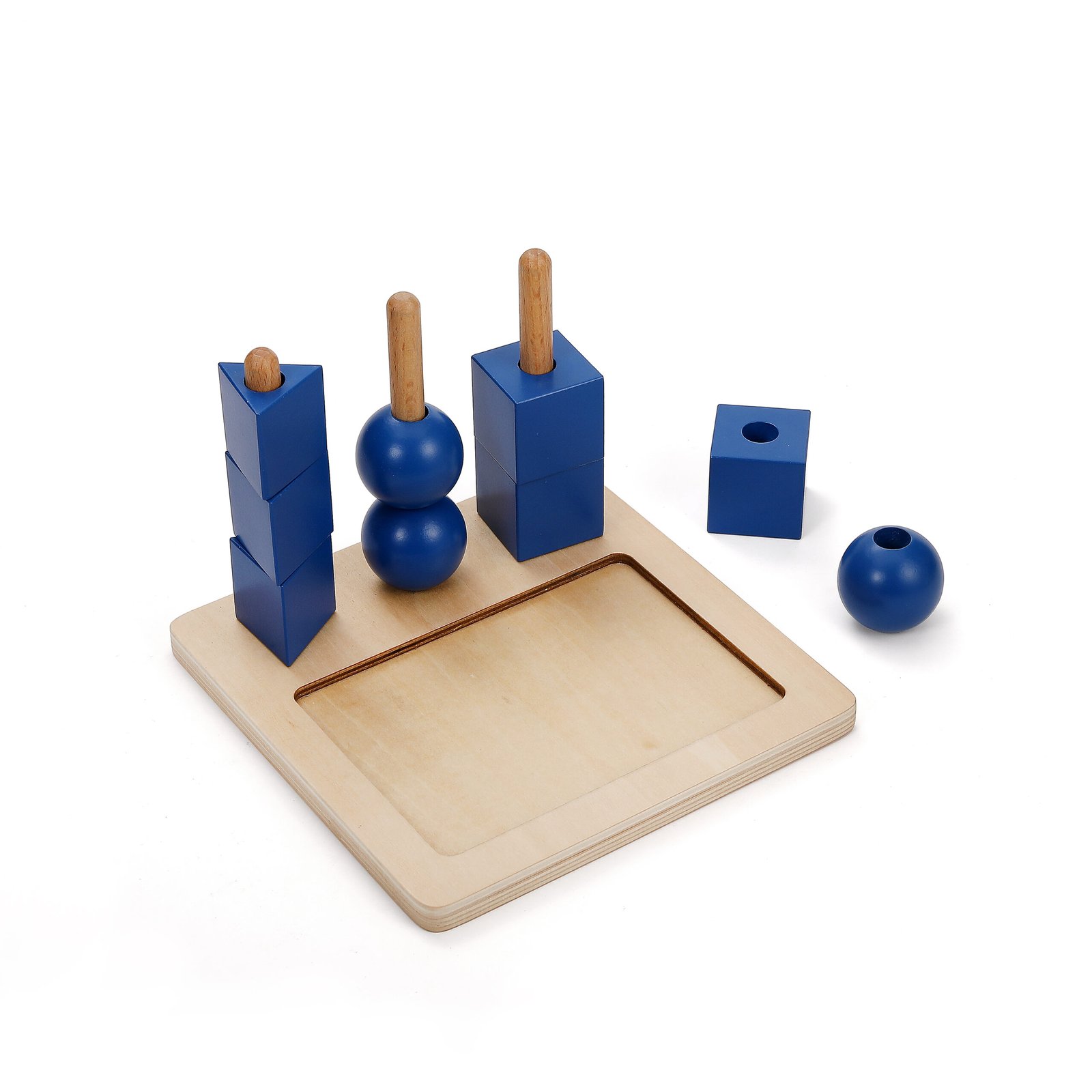 La actividad implica que el niño observe el orificio en el centro de cada pieza y la forma del bloque, asociándola con la clavija que la atraviesa.