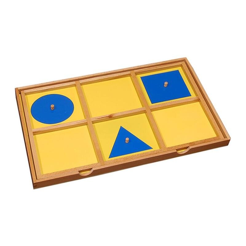 La Bandeja de Demostración Geométrica consiste en una base de madera dividida en tres compartimentos, cada uno con un inserto geométrico azul sobre fondo amarillo.
