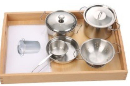 El niño observa y manipula utensilios de cocina, emparejándolos con sus tarjetas correspondientes. Esta actividad desarrolla el lenguaje y el sentido de relación entre la vida doméstica y el aprendizaje. Además, promueve la clasificación, la concentración y la coordinación ojo-mano.
