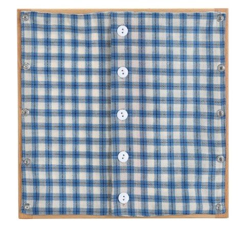 El marco con botones pequeños requiere mayor destreza y control que el de botones grandes. El niño refina su coordinación ojo-mano al introducir y sacar los botones de los ojales, fortaleciendo la motricidad fina y la atención sostenida.