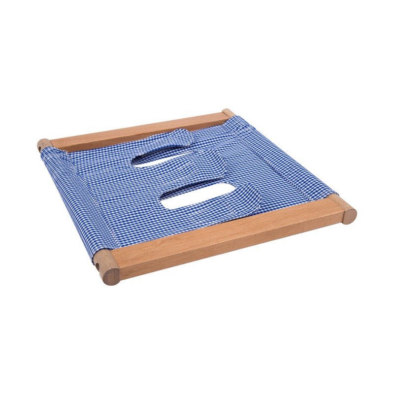 Este marco Montessori cuenta con dos paneles de tela unidos por tiras de velcro.