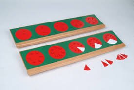 Este material permite al niño ver, tocar y comparar las fracciones. Se comienza presentando el círculo entero (la unidad), y progresivamente se introducen las fracciones menores.
