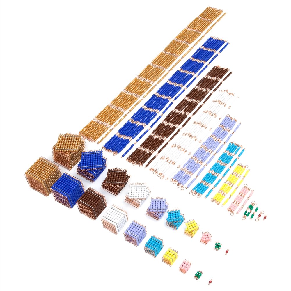 El juego completo de perlas Montessori ofrece una representación tangible de los valores matemáticos. A través de su manipulación, el niño comprende de manera visual y sensorial la estructura del sistema decimal, la multiplicación, división, potencias y raíces.