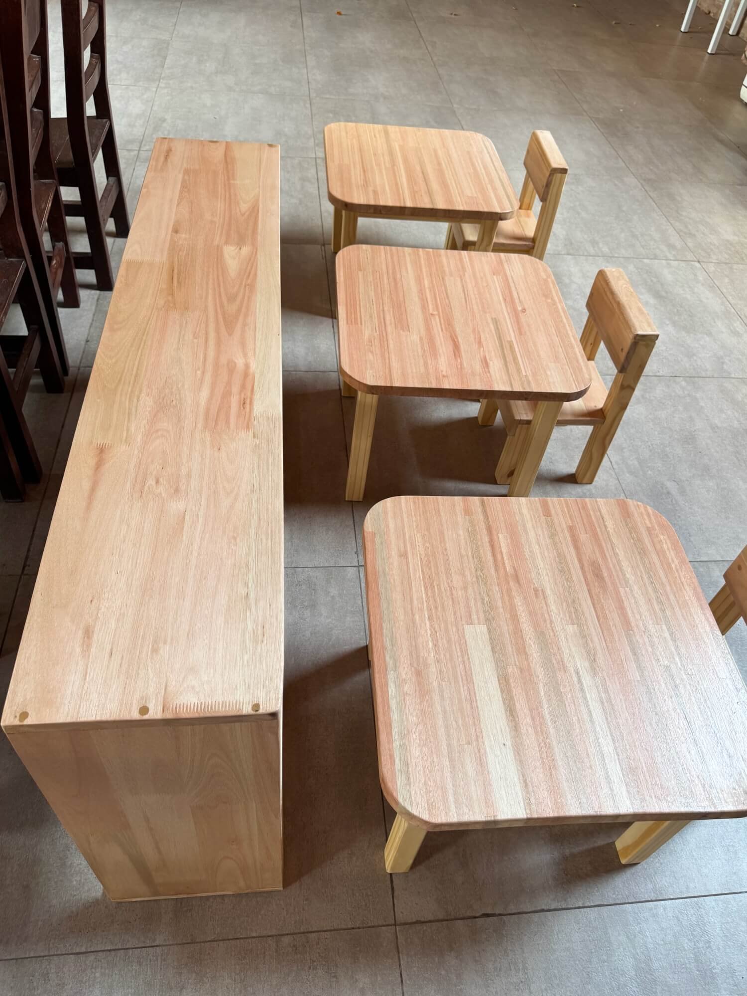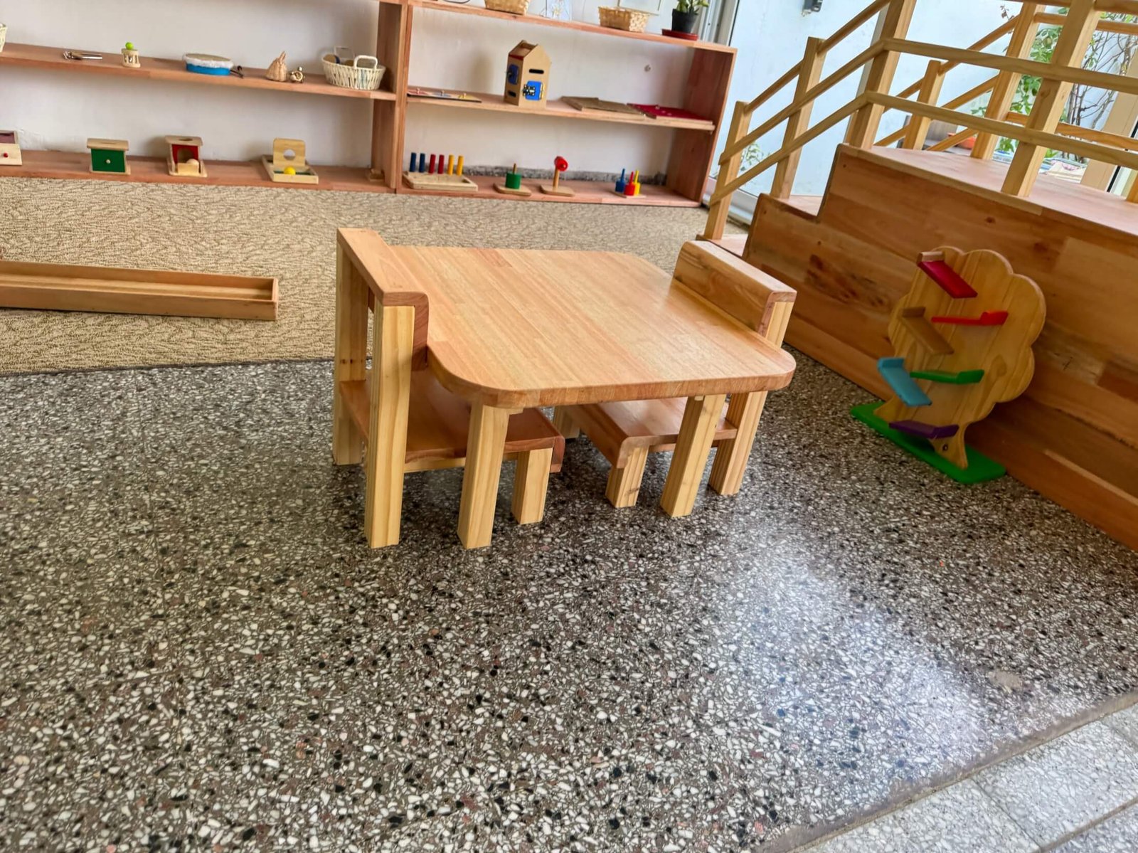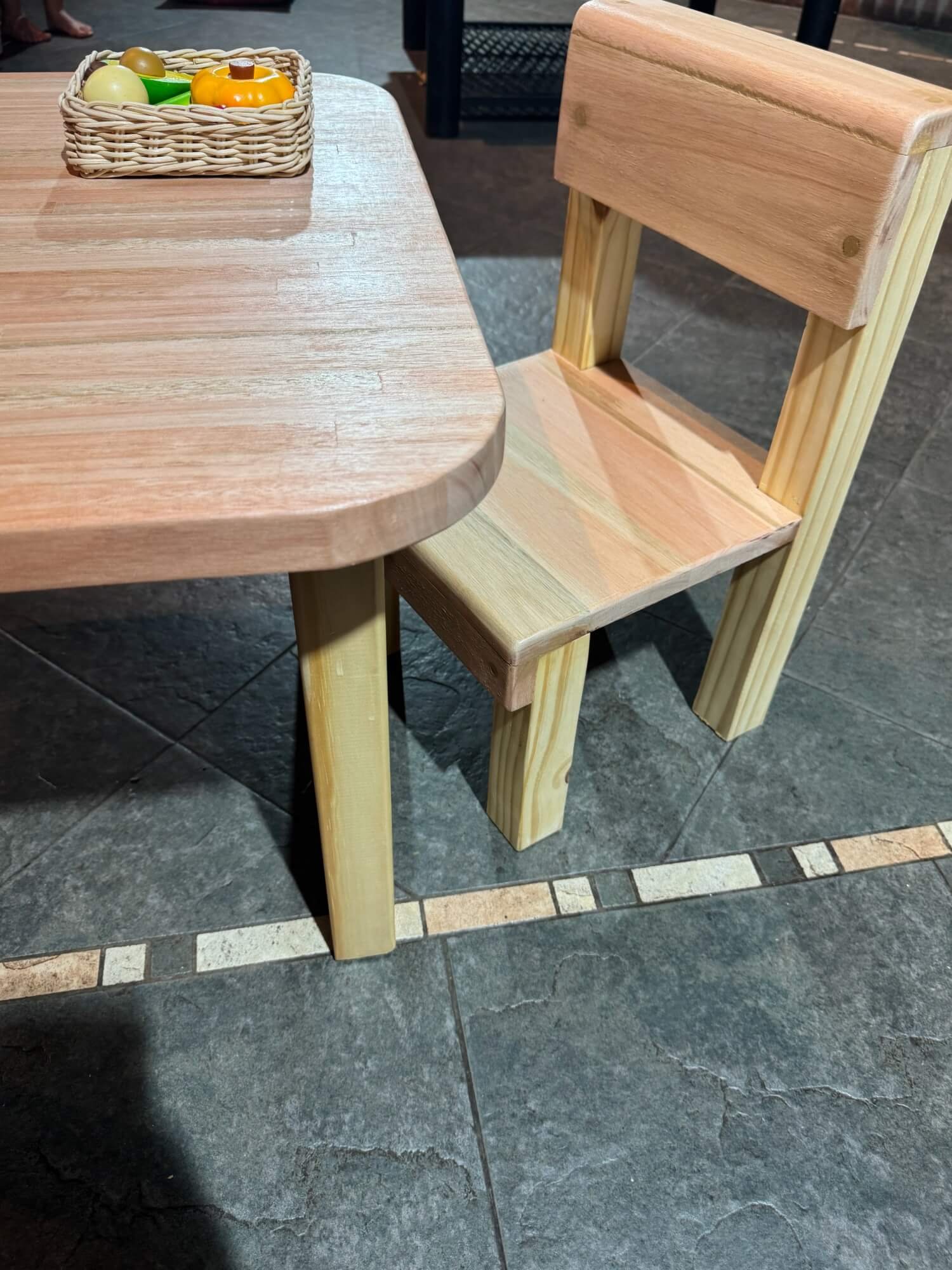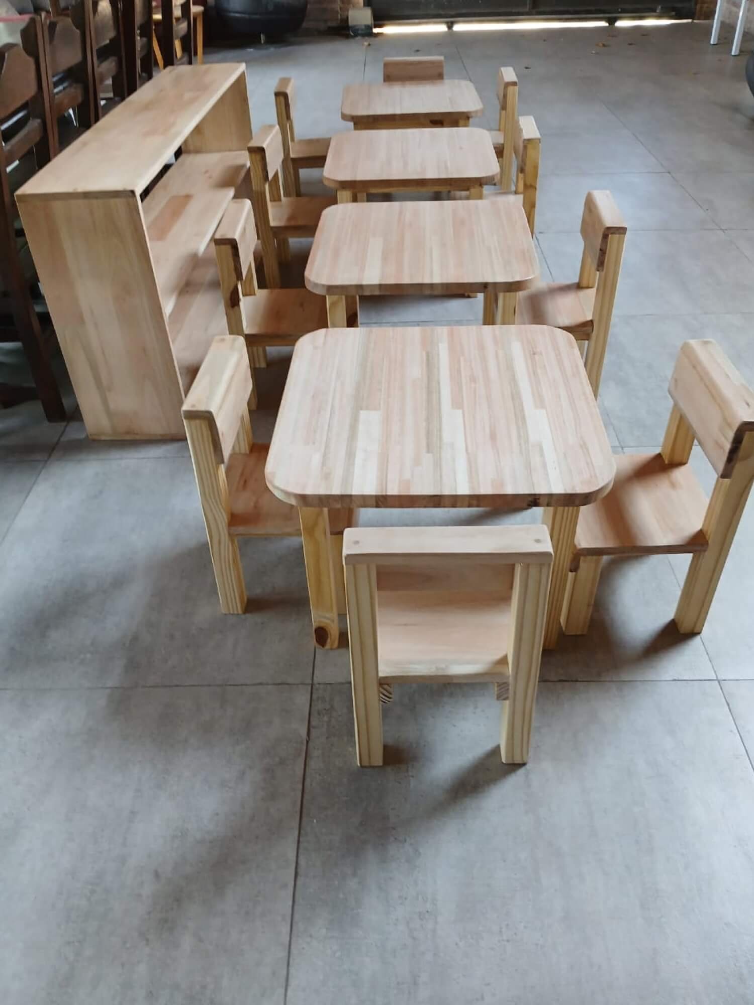 Mesita con sillita de eucalipto multilaminado reforzado con hidrolaca, en distintos tamaños adaptados a cada etapa educativa