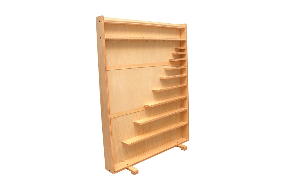 Este mueble permite mantener ordenado y accesible el material de perlas doradas, cadenas, cubos y flechas de conteo. Su disposición favorece que el niño identifique visualmente las progresiones numéricas y acceda con independencia a los recursos necesarios para sus actividades matemáticas. Es un elemento clave dentro del área de matemática, que apoya la organización del entorno y refuerza los principios de autonomía y responsabilidad propios del método Montessori.