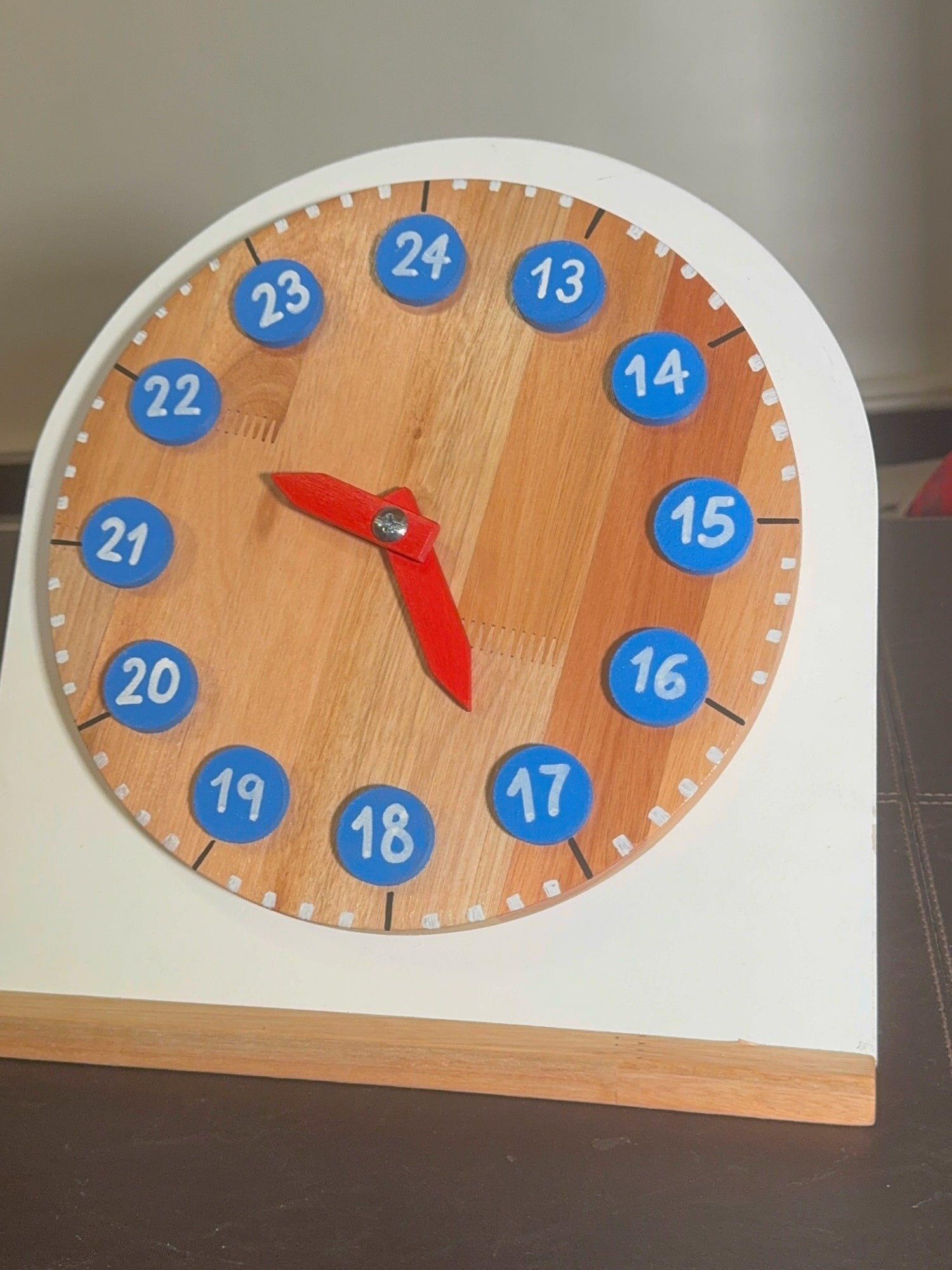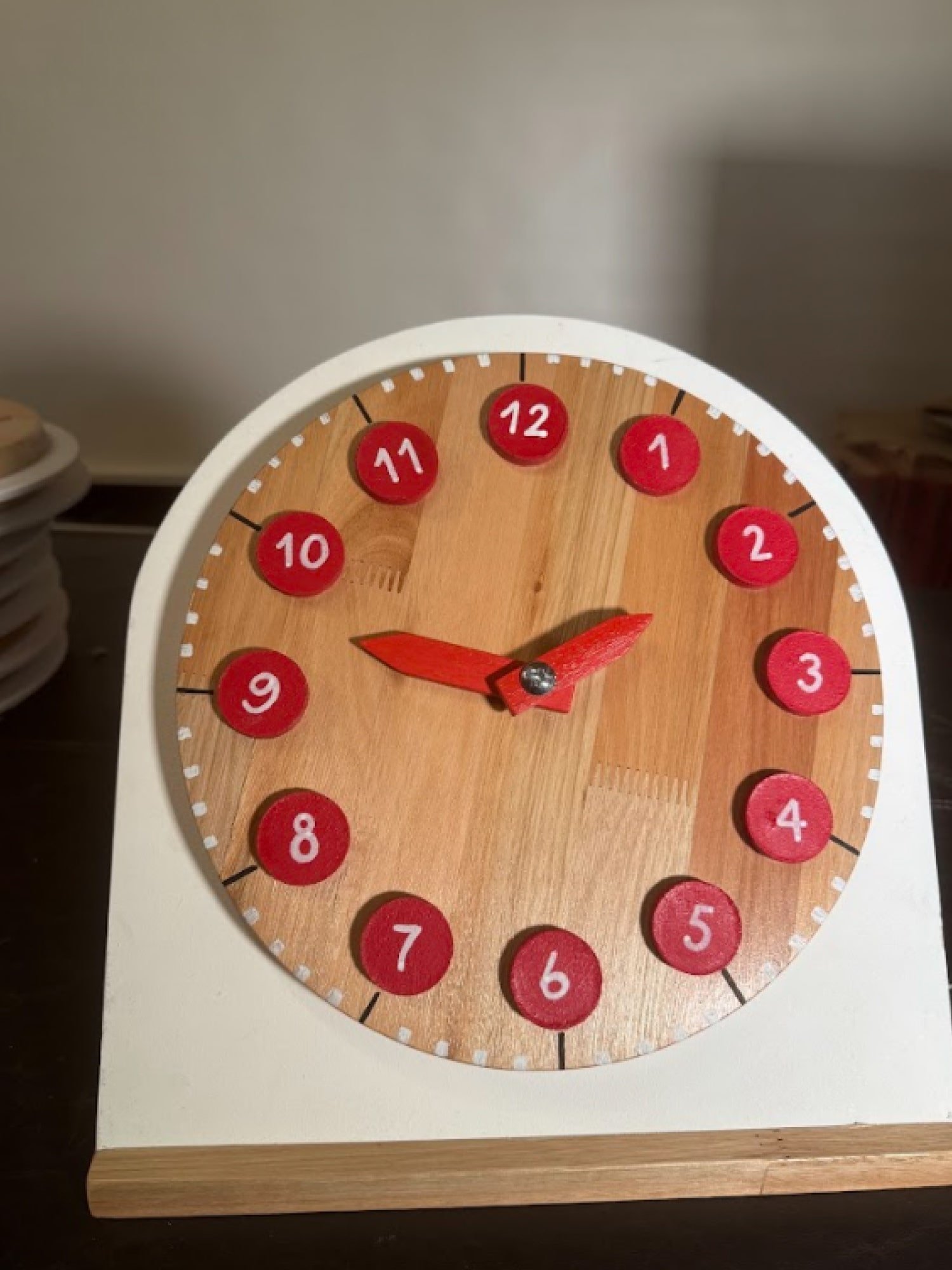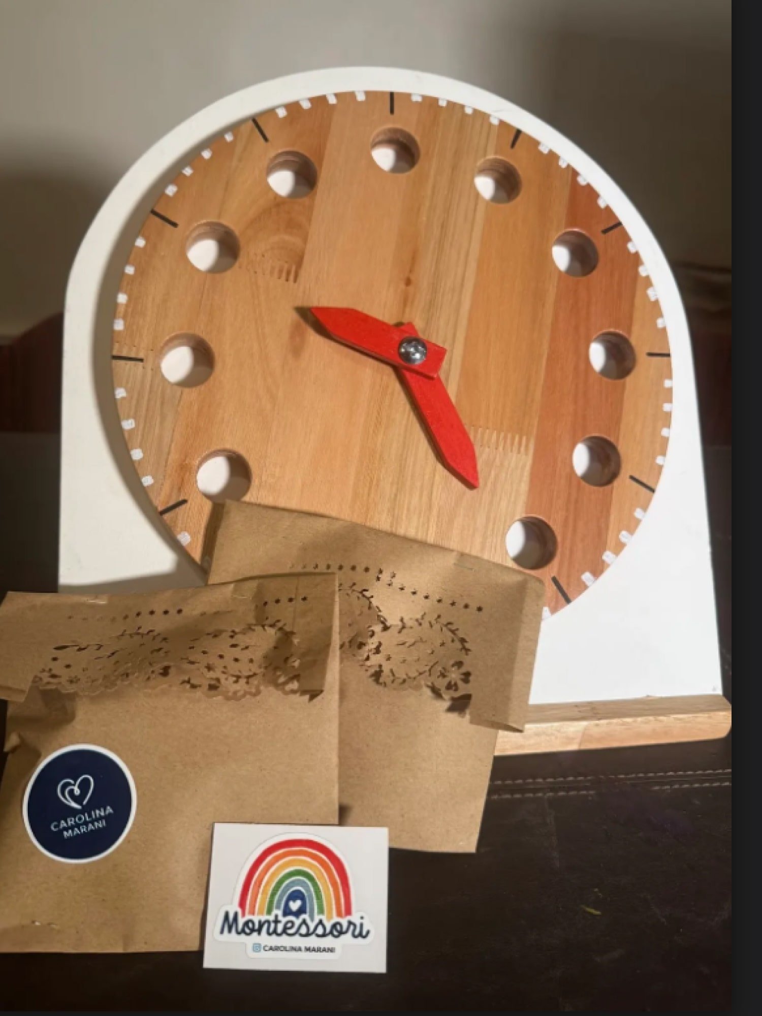 El reloj Montessori es un material de matemática fundamental para el pasaje de lo concreto a lo abstracto en la comprensión del tiempo. Su diseño permite que los niños exploren de manera manipulativa la relación entre horas y minutos, desarrollando una noción clara y vivencial del tiempo, con control de error natural y la posibilidad de avanzar a su propio ritmo.
