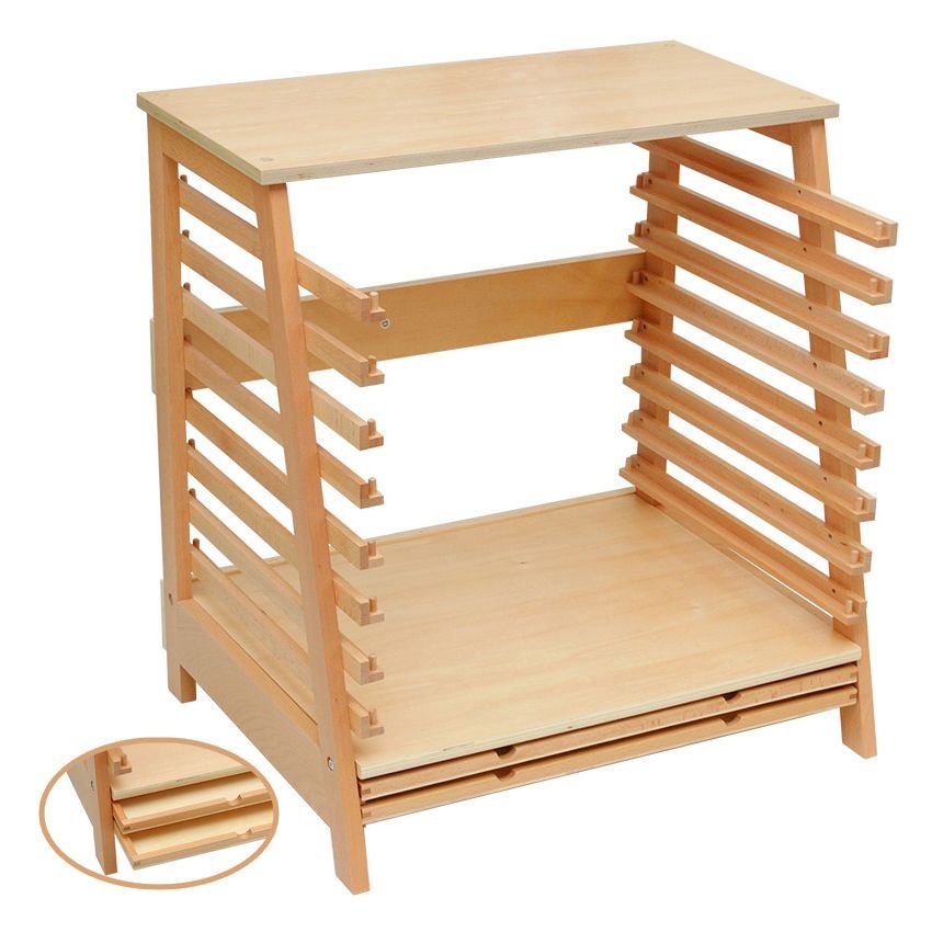El soporte para rompecabezas Montessori de mapas permite almacenar y exhibir los distintos mapas de geografía de manera ordenada y funcional. Fabricado en madera robusta, su diseño facilita que los niños puedan tomar y guardar los mapas por sí mismos, reforzando el principio Montessori de autonomía en el uso de los materiales.