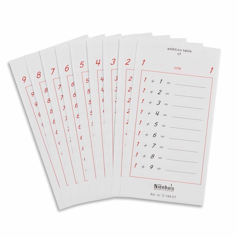 Las tablas presentan combinaciones organizadas por número, y pueden utilizarse junto a los tableros de trabajo o de forma independiente. Permiten la práctica sistemática y la repetición de todas las sumas básicas de manera ordenada y autocorrectiva.