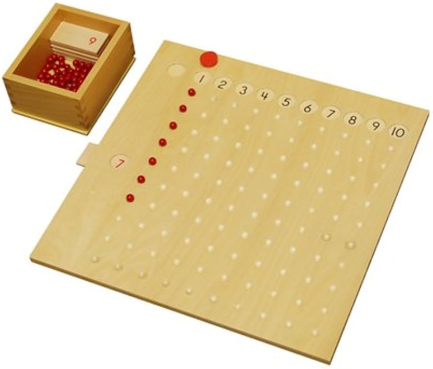 El Tablero para Multiplicación permite al niño experimentar la operación multiplicativa utilizando perlas rojas y una cuadrícula numerada del 1 al 10. Cada fila representa un número que se multiplica, y las perlas se colocan según la cantidad de veces que se repite.