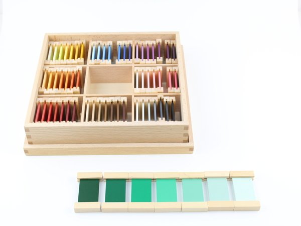 El material se presenta en una caja de madera dividida en compartimientos, que invita al niño a clasificar y organizar visualmente las tabletas. Durante la actividad, el niño toma una serie de un color y ordena las tabletas en una gradación progresiva, observando las sutilezas entre tonos. Este ejercicio agudiza la percepción visual y promueve la atención concentrada.