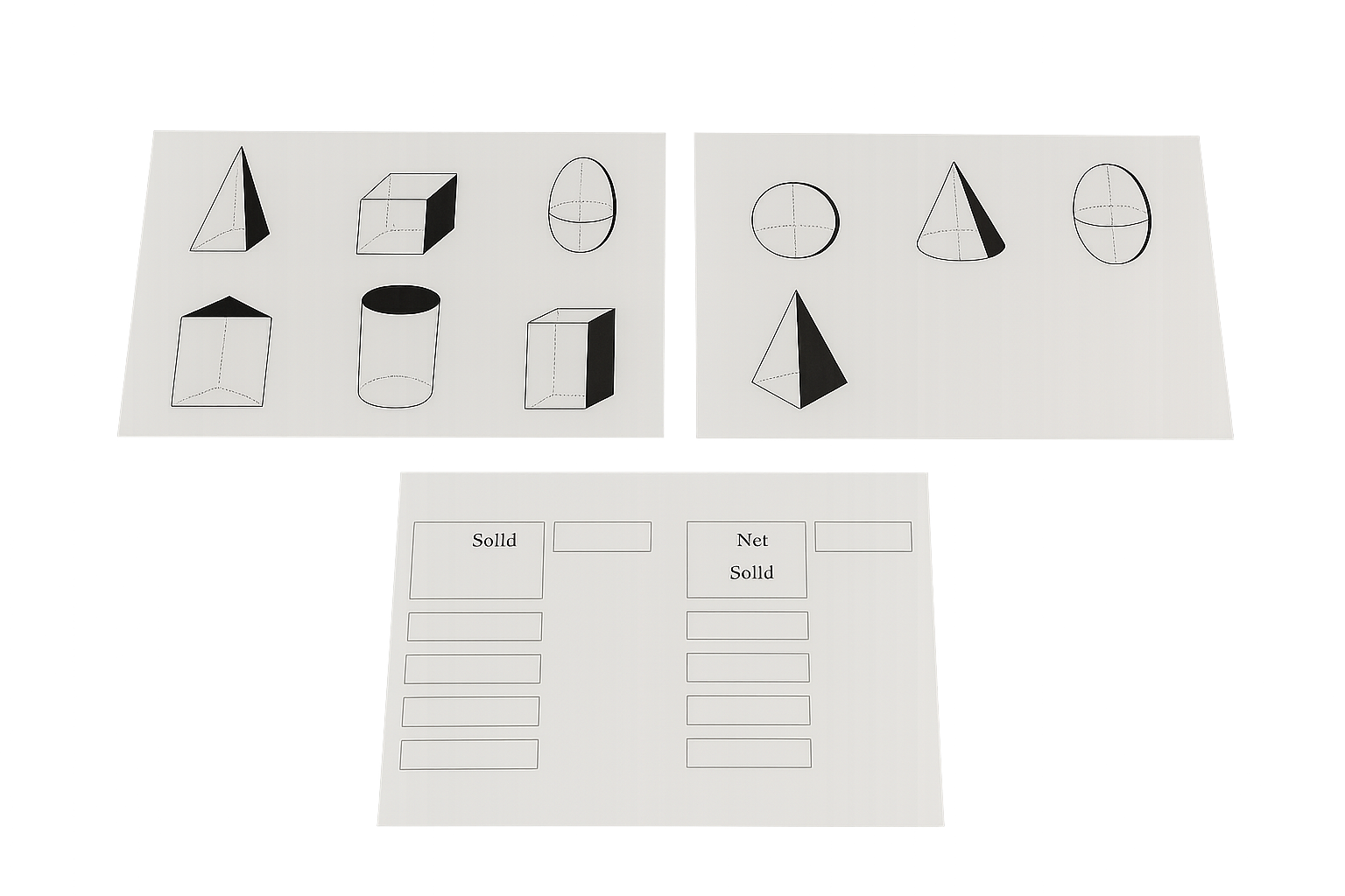 Las tarjetas geométricas de la segunda serie Montessori presentan variaciones en tamaño y trazo para cada figura, estimulando la discriminación visual y la concentración. Se utilizan junto a las figuras recortadas o los sólidos geométricos, promoviendo el aprendizaje concreto y visual.